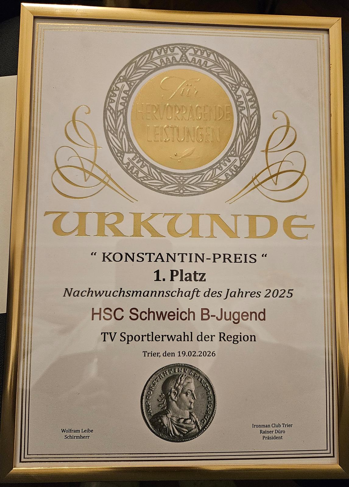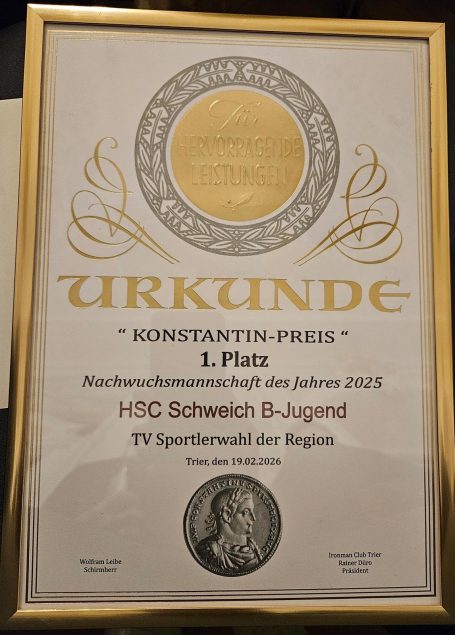 Mit 31.53% Prozent und einem deutlichen Vorsprung gewann die weibliche B-Jugend des HSC Schweich in der Kategorie „Nachwuchsmannschaft des Jahres 2025“. Bereits im Jahr 2024 konnte diese Kategorie gewonnen werden und somit ist die Titelverteidigung gelungen. Sophie Lellinger, Kapitänin der Mannschaft, nahm den Konstantin-Preis in Empfang und bedankte sich stellvertretend für Ihr Team für die Auszeichnung. „Wir sind stolz über die Auszeichnung und wollen in der Restsaison unsere guten Leistungen in der Bundesliga bestätigen“ so Lellinger, die leider verletzungsbedingt die Restsaison nicht mehr auf dem Feld stehen kann.