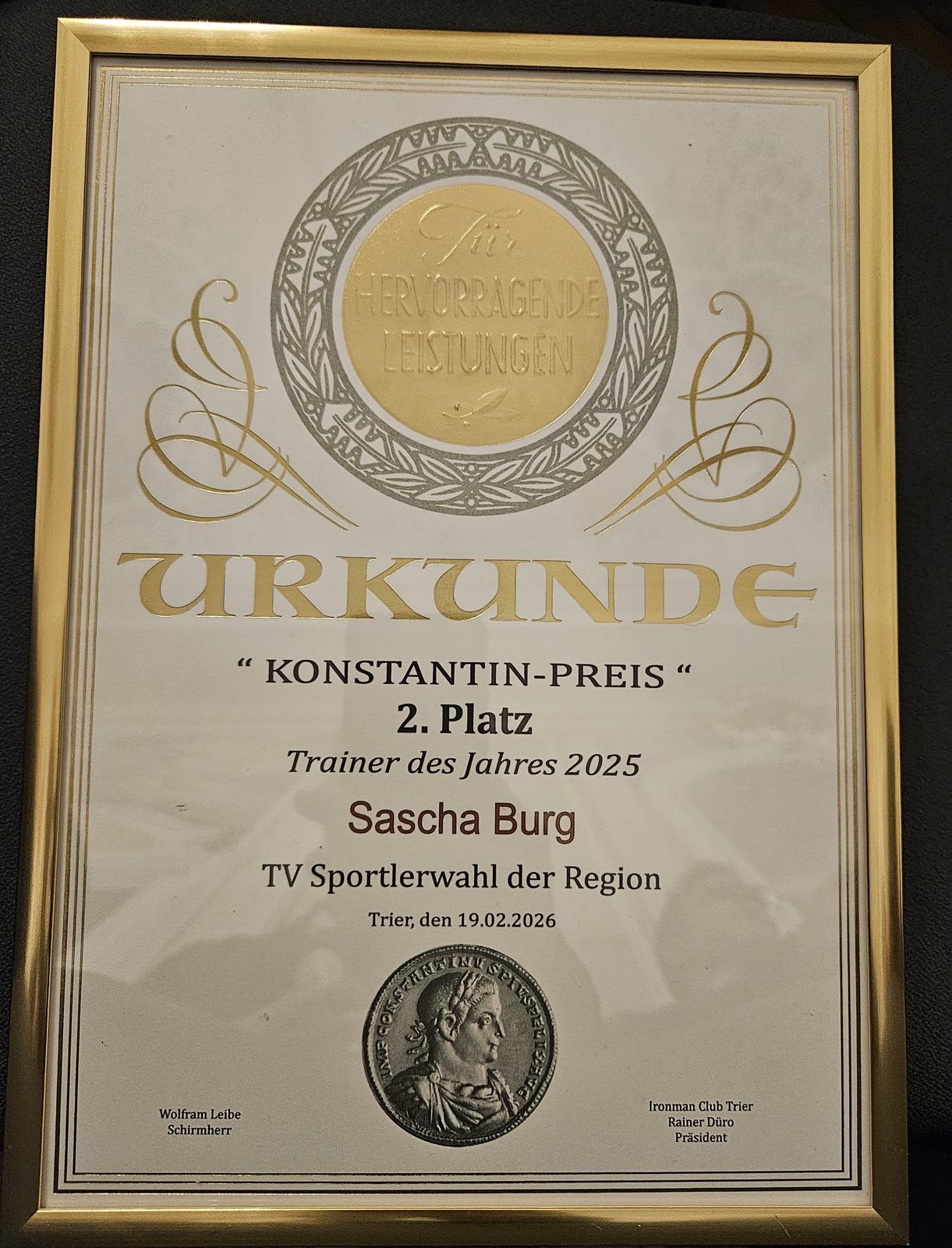 Mit 26,95% der Stimmen erreichte Trainer Sascha Burg in der Kategorie „Trainer des Jahres 2025“ den zweiten Platz und zeigte sich auf der Bühne als Teamplayer: „Meine Trainerkollegen Marc Birchen, Florian Weins sowie Athletiktrainer Pascale Engel haben ebenfalls einen großen Anteil am Erfolg dieser Mannschaft. Mein Dank gilt den Sponsoren Vet-Concept, Müller Kylltal Reisen, SWT Trier sowie Volksbank Trier, ohne deren Unterstützung wir nicht in der Bundesliga antreten könnten.“